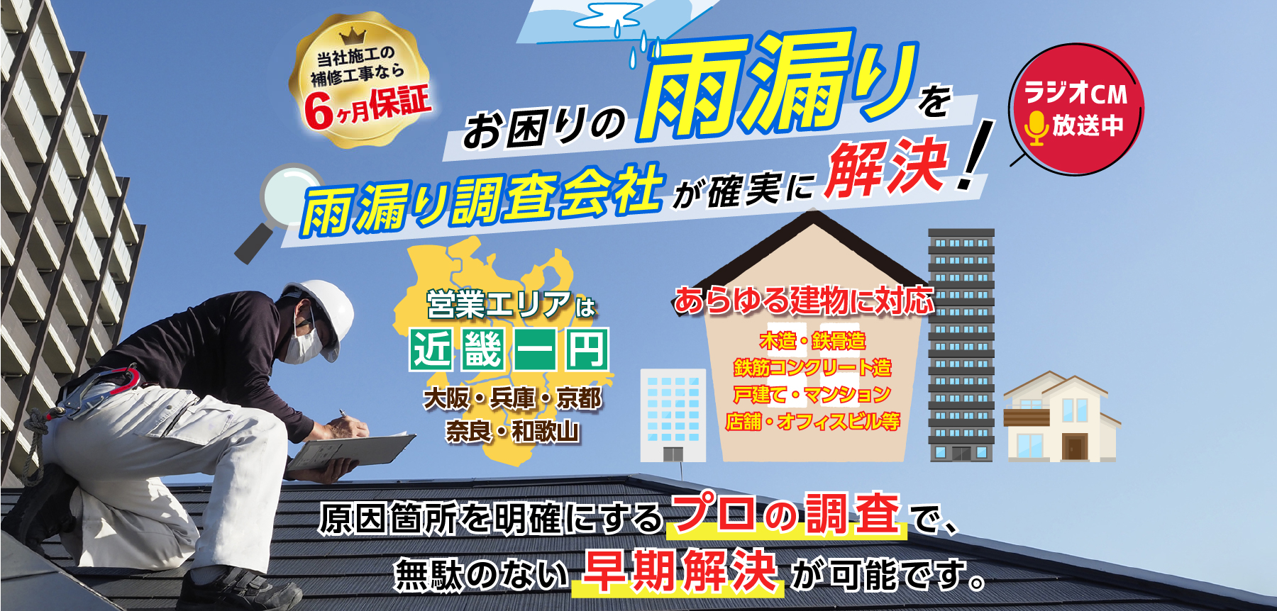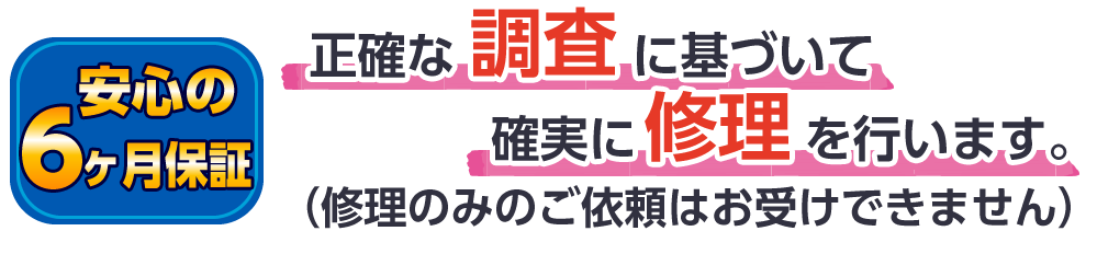 当社に補修工事までご依頼いただいた場合、同一箇所・同一原因での雨漏りに関して6ヶ月間保証いたします。調査のみのご依頼は対象外です。