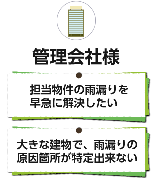 2階の入居者様から壁から雨漏りがすると連絡があり、8階建ての2階だからサッシからの雨漏りだと思い、サッシ回りのコーキング修理などで補修をしましたが雨漏りが止まず、外壁全体の塗装の補修を検討していたところ、こちらのホームページを拝見し調査を依頼しました。